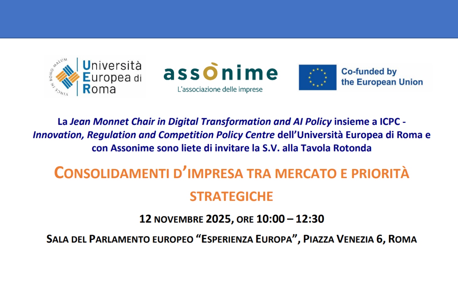 La Jean Monnet Chair in Digital Transformation and AI Policy insieme a ICPC - Innovation, Regulation and Competition Policy Centre dell’Università Europea di Roma e con Assonime sono liete di invitare la S.V. alla Tavola Rotonda. 12 novembre 2025, ore 10:00 – 12:30 - Sala del parlamento europeo “esperienza europa”, piazza venezia 6, Roma Partecipa: Valeria Falce Jean Monnet Professor of EU Innovation Policy; Professor in Digital Transformation and AI Policy; Ordinario di diritto d...
