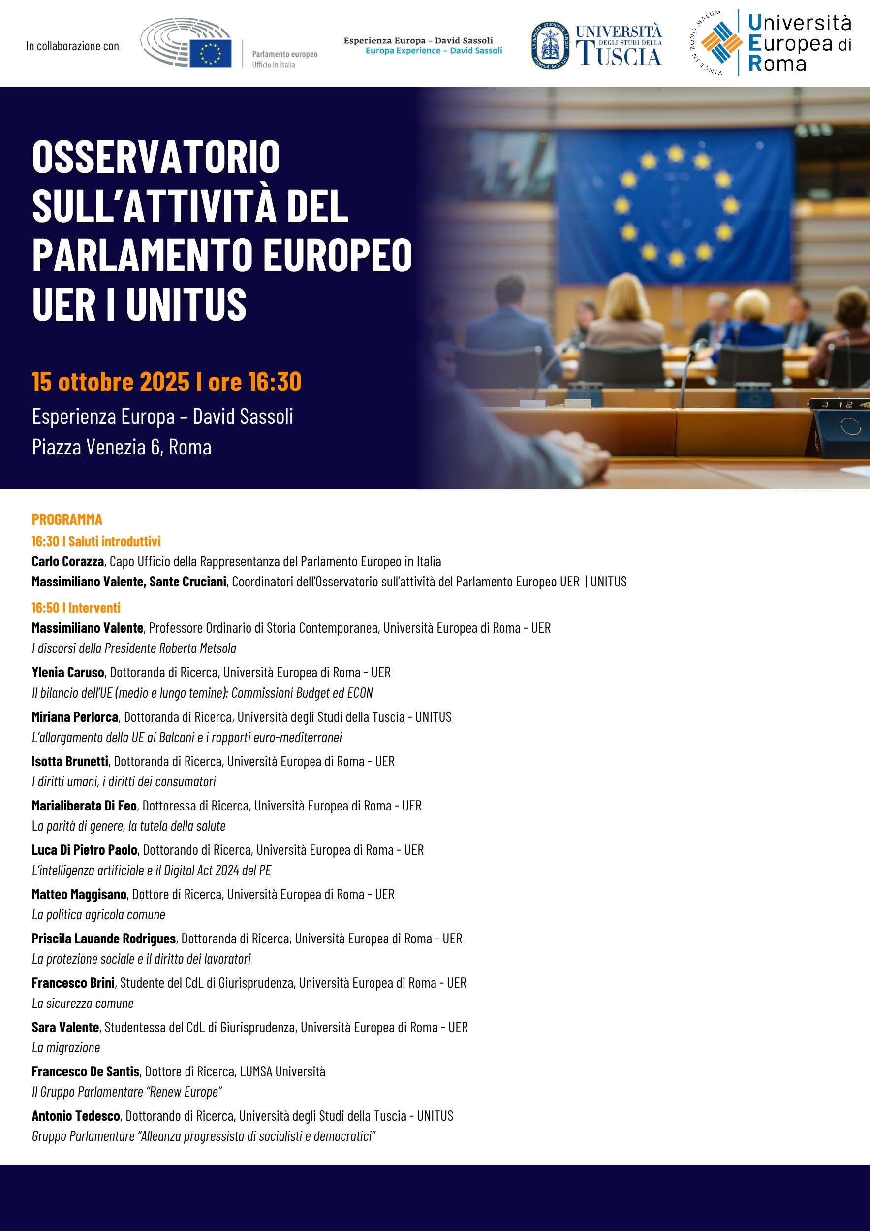 L’Osservatorio sull’attività del Parlamento Europeo UER | UNITUS formato da studenti universitari, studenti dottorali e dottori di ricerca, ha per scopo la realizzazione di un focus multidisciplinare sull’Assemblea di Strasburgo.