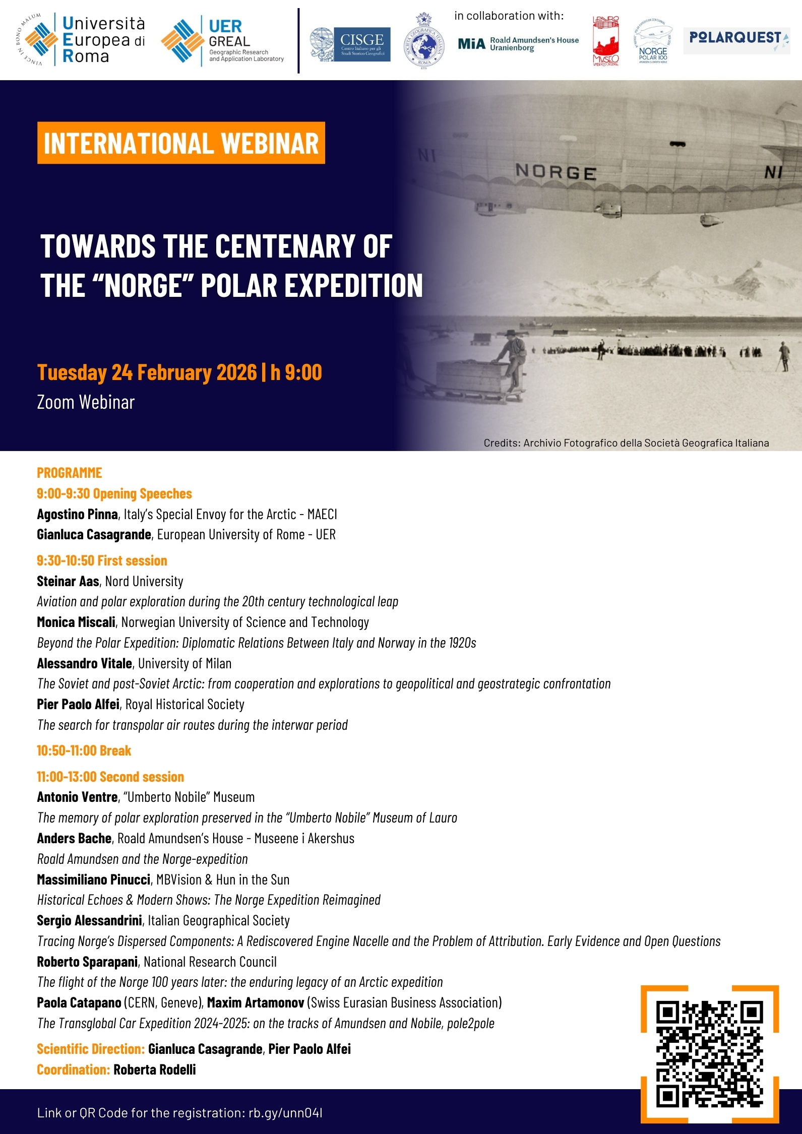 The Geographic Research and Application Laboratory (GREAL) of the European University of Rome announces that on Tuesday 24 February 2026, from 9:00 a.m. to 1:00 p.m., it will hold, online, the international webinar Towards the Centenary of the “Norge” Polar Expedition. A few days before the Arctic Circle Forum (Rome, 3-4 March) and the upcoming centenary of the first transpolar flight (April-May 1926), the webinar aims to investigate a selection of key issues related to the historic feat and its memory.