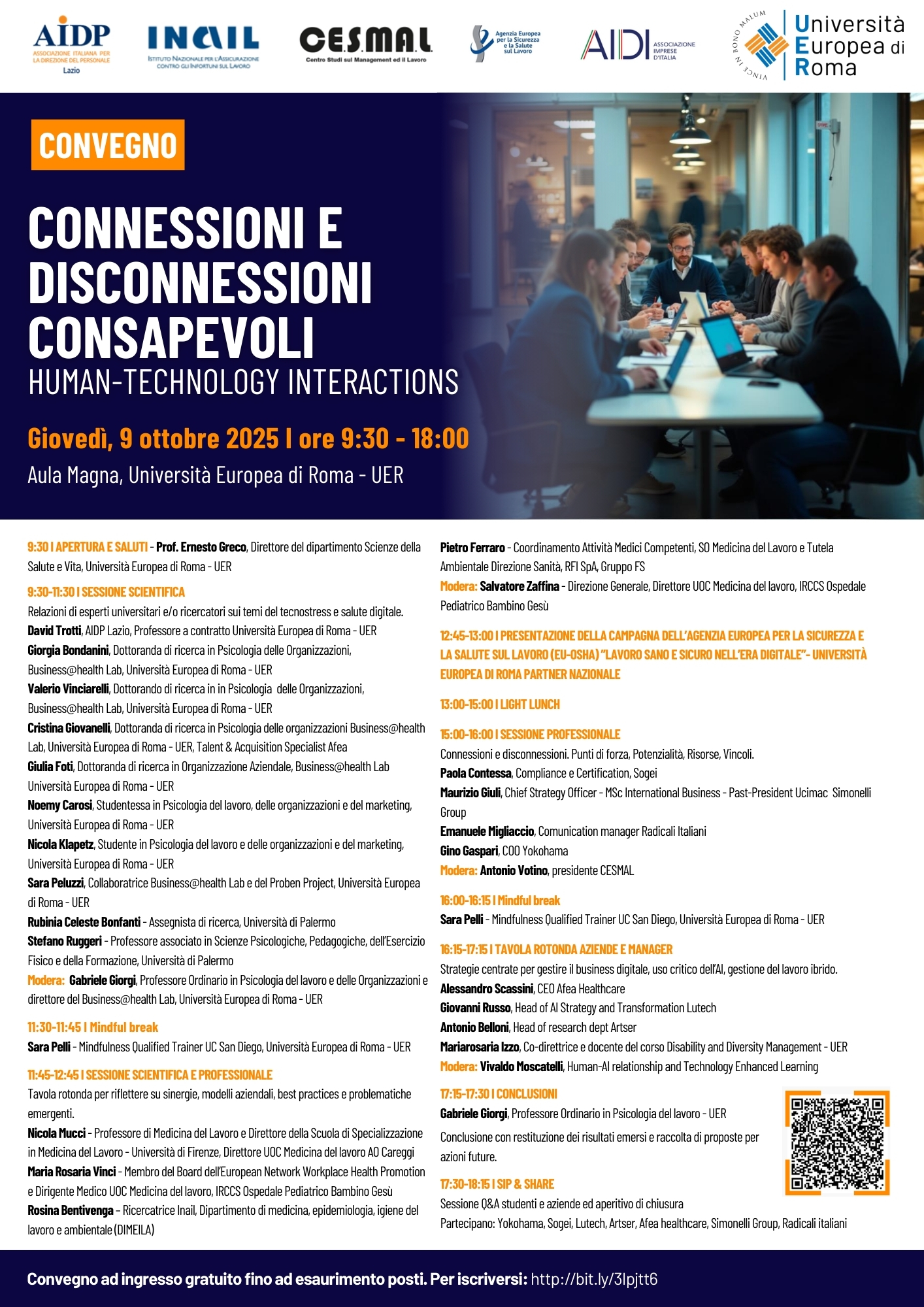 Il convegno offrirà uno sguardo aggiornato e scientificamente fondato sui temi emergenti del lavoro digitale, grazie alla presentazione delle più recenti ricerche condotte dal Business@Health Lab. – il centro di Ricerca sul lavoro, dell’Università Europea di Roma, diretto dal Prof. Gabriele Giorgi.