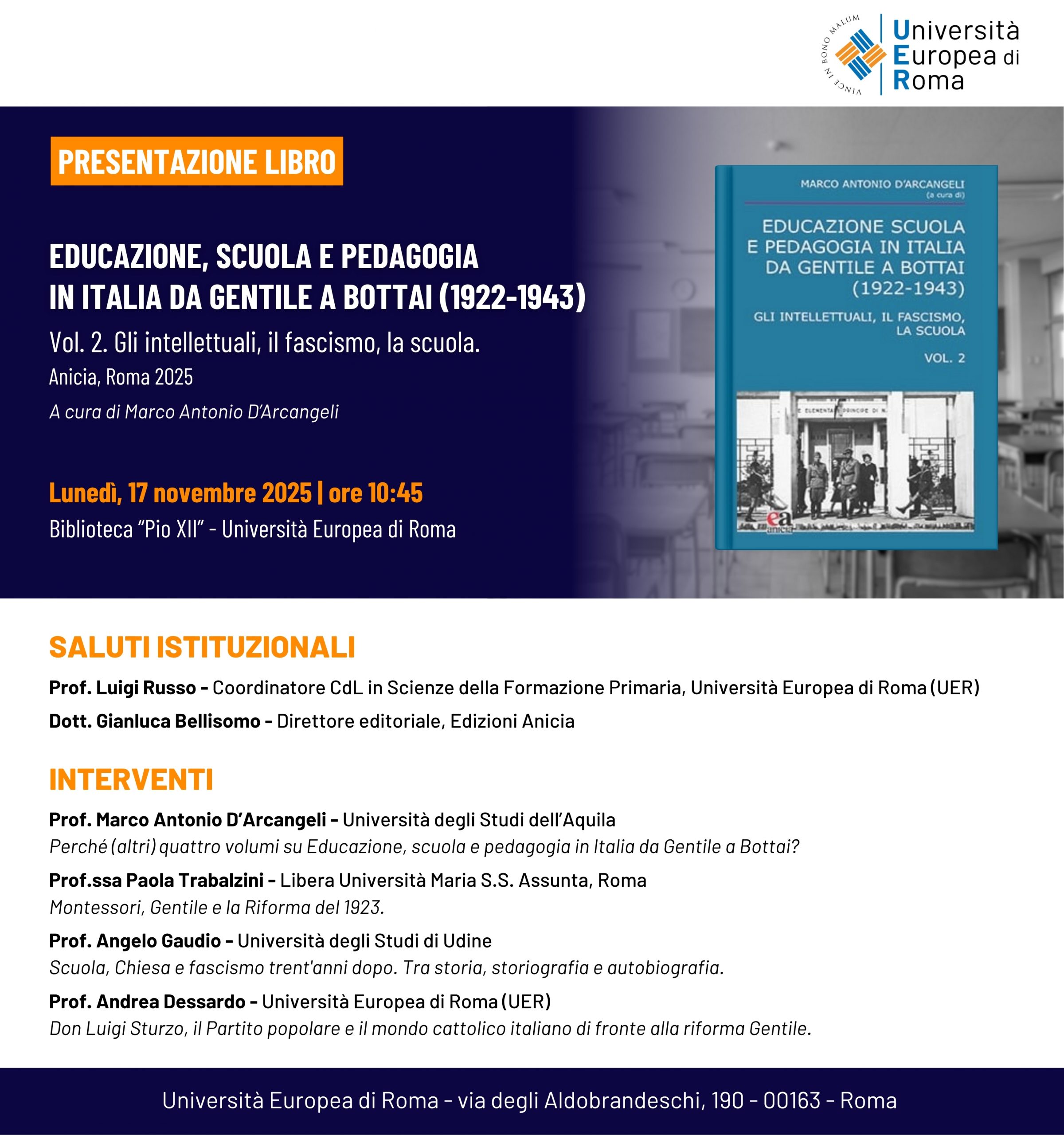L’incontro sarà aperto dai saluti istituzionali del prof. Luigi Russo, Coordinatore del corso di laurea magistrale in Scienze della formazione primaria dell’Università Europea di Roma, e del dott. Gianluca Bellisomo, direttore editoriale di Edizioni Anicia.